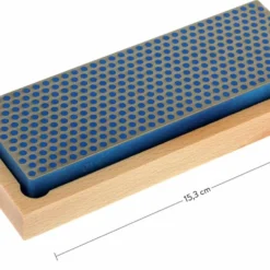 Pierre à aiguiser à la surface d’aiguisage diamantée pourvue du motif à pois caractéristique de DMT. Cette pierre a un grain fin. Cette pierre à aiguiser est livrée dans un boîtier en bois pourvu de pieds antidérapants.