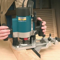 - La butée d’angle, réglable au degré près, assure un guidage précis et offre la stabilité nécessaire pour les coupes à onglet et les coupes à double onglet.