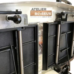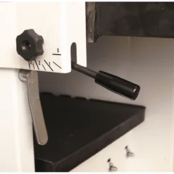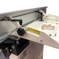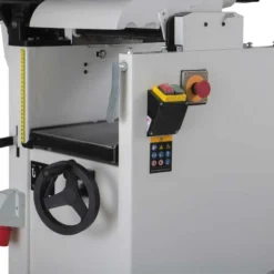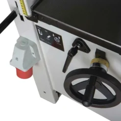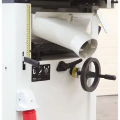 Réglage de la hauteur de la table de rabotage avec échelle millimétrique le long de la table, et autour de la manivelle de montée/descente.