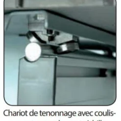 - Table de chariotage en aluminium avec presseur vertical à serrage excentrique, guide d’angle, règle de grande dimension (extensible jusqu‘à 1500 mm), butée de longueur avec réglage micrométrique équipée d’une règle à tenonner. La table de chariotage est démontable en un tour de main, sans outil.