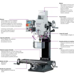 Deux plages de vitesses par boîte mécanique garantissant le couple durant les usinages moteur. Pour percer / fraiser dans tous les angles la tête de cette fraiseuse conventionnelle s’incline à ± 90%.
