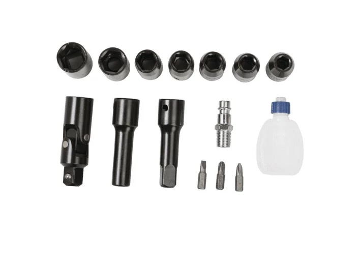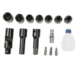 - Comprend 7 clés à douille 1/2″, 1 rallonge 1/2″, 1 joint de cardan, 1 porte-embout, 3 embouts, 1 bouteille d’huile