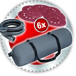 - De nombreux accessoires font partie de la livraison : 1 flexible de raccordement à un aspirateur de 1500 mm, 1 lot de 6 disques abrasifs et un sac de récupération de poussière