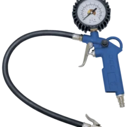 - Un pistolet de gonflage avec un manomètre à affichage en bar/psi, protégé par une coque en caoutchouc et équipé d’un bouton de dégonflage