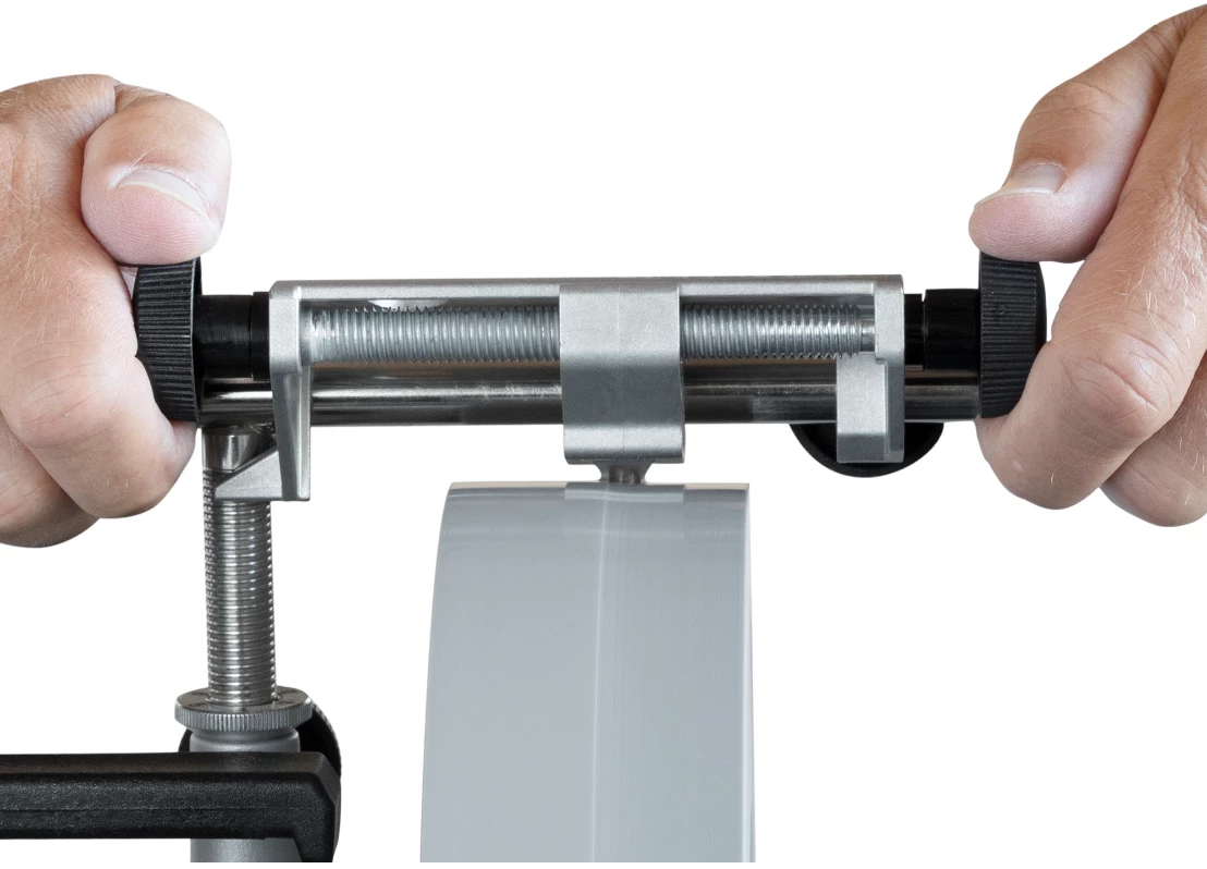 - Vous distribuerez de façon pratique l’outil tranchant diamanté au-dessus de la meule en faisant tourner alternativement les deux boutons avec vos deux mains. Grâce à cette distribution contrôlée, vous obtiendrez une surface de meule plate et régulière, sans aucune rainure.