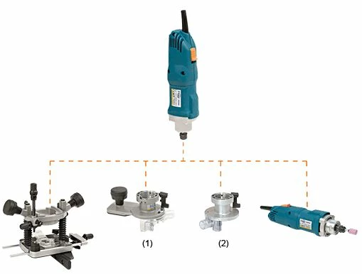 - Sa capacité « COMBI » permet de travailler avec différents types de têtes optionnelles, aussi bien comme une défonceuse que comme une affleureuse, et même en meuleuse droite.